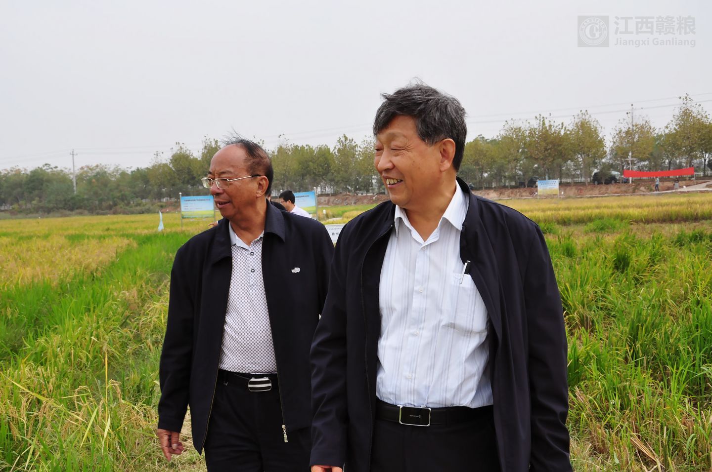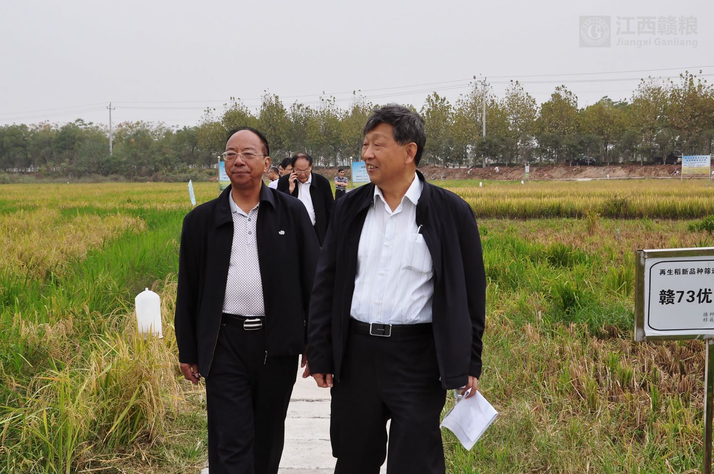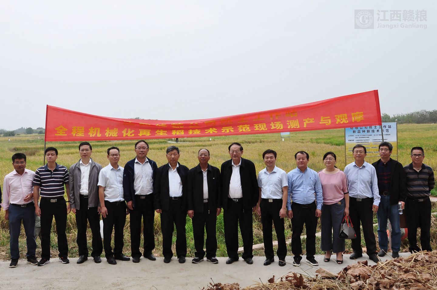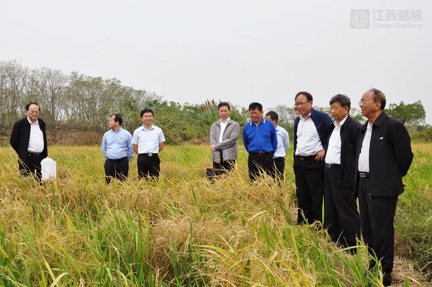 院士、領導、專家先到贛糧公司院士工作站南昌岡上試驗基地現(xiàn)場觀摩再生稻的試驗示范情況。院士一行步入田間查看了再生稻的生長情況,對再生稻示范品種“內(nèi)6優(yōu)7075”再生季長勢和結(jié)實率表示肯定。對生產(chǎn)試驗中存在的不足進行實地指導。針對因第一季機械收割造成的嚴重碾壓影響再生季產(chǎn)量的問題,三位院士表示要進行栽培與機械聯(lián)合技術攻關。