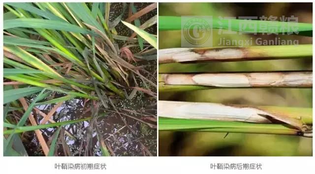 葉鞘染病:初期在近水面處產(chǎn)生暗綠色水浸狀邊緣模糊小斑,后漸擴大呈橢圓形或云紋形,邊緣暗褐,中部呈灰白色半透明狀,潮濕時為灰綠色。