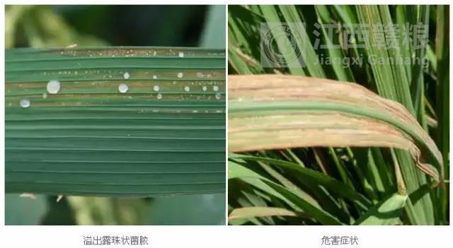 2、病斑上常溢出許多露珠狀黃色菌膿,干后呈黃色膠狀小粒,不易脫落,發(fā)病嚴重時融合成不規(guī)則黃褐至枯白大斑,與白葉枯類似,但對光可見許多半透明細條。