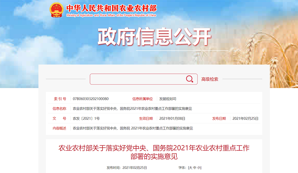農(nóng)業(yè)農(nóng)村部關(guān)于落實好黨中央、國務(wù)院2021年農(nóng)業(yè)農(nóng)村重點工作部署的實施意見