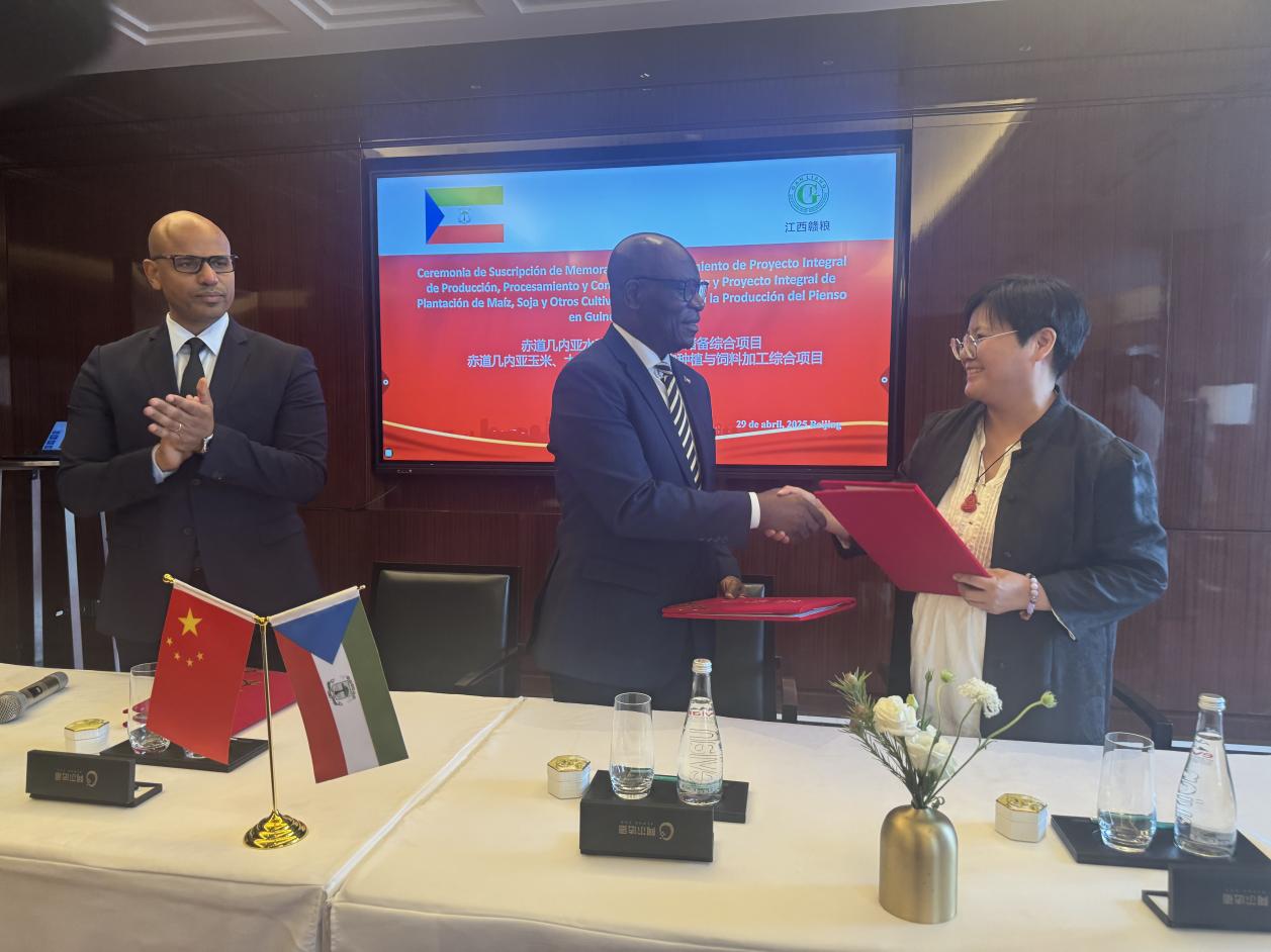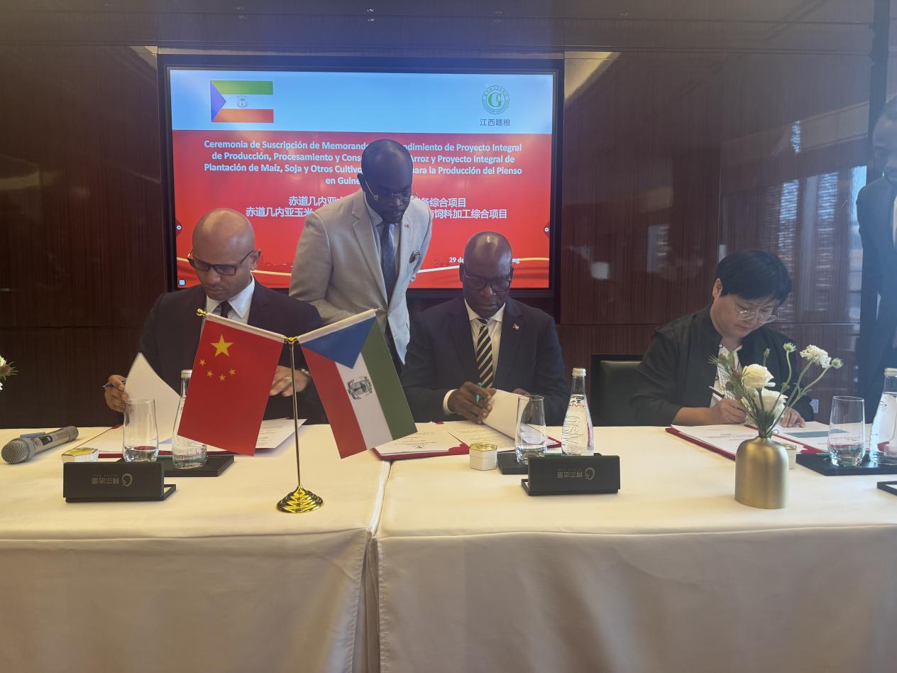 2025年4月29日下午,在赤道幾內(nèi)亞副總統(tǒng)特奧多羅?恩圭馬?奧比昂?曼格副總統(tǒng)的見證下,江西贛糧實(shí)業(yè)有限公司與赤道幾內(nèi)亞政府于北京舉行《赤道幾內(nèi)亞水稻生產(chǎn)、加工和儲(chǔ)備綜合項(xiàng)目》和《赤道幾內(nèi)亞玉米、大豆及其他飼料作物種植與飼料加工綜合項(xiàng)目》諒解備忘錄簽約儀式。羅利平董事長(zhǎng)、赤幾外交、國(guó)際合作與僑務(wù)部部長(zhǎng)西蒙?奧約諾?恩索諾?安格閣下和財(cái)政、規(guī)劃與經(jīng)濟(jì)發(fā)展部部長(zhǎng)伊萬?巴卡萊?埃貝?莫利納閣下分別代表雙方簽署協(xié)議。