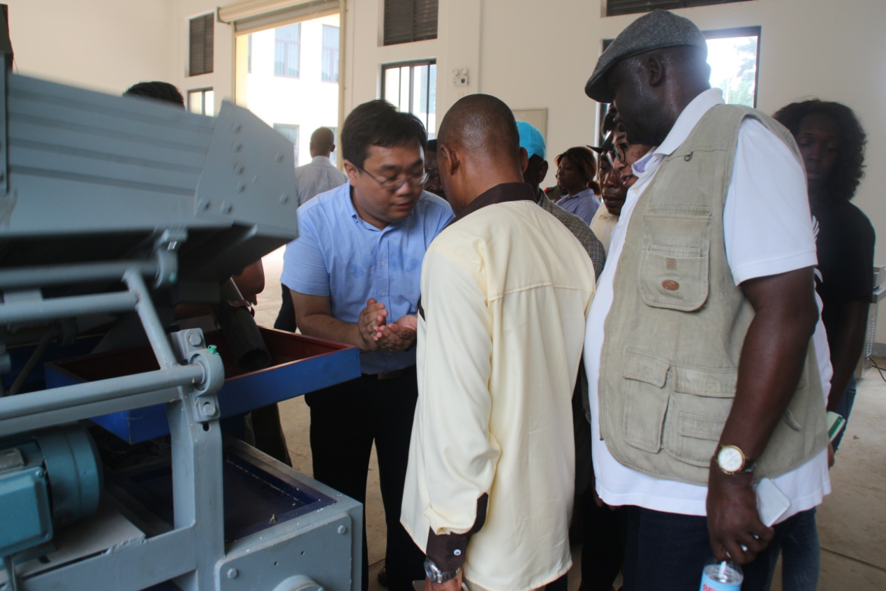 農林部駐大陸代表參觀了示范農場示范生產車間、蔬菜大棚、簡易大棚、全自動氣象站、太陽能滅蟲燈以及蔬菜、木薯、香蕉、芭蕉和水稻等作物的種植情況。農林部駐大陸代表詳細了解了水稻種植和大米生產情況,并對示范農場種植出赤道幾內亞第一批水稻,生產出赤道幾內亞第一批大米表示感謝和贊揚。他希望示范農場能擴大水稻種植面積,推動赤幾水稻產業(yè)的發(fā)展,讓赤幾人人都能吃上自己生產的大米。